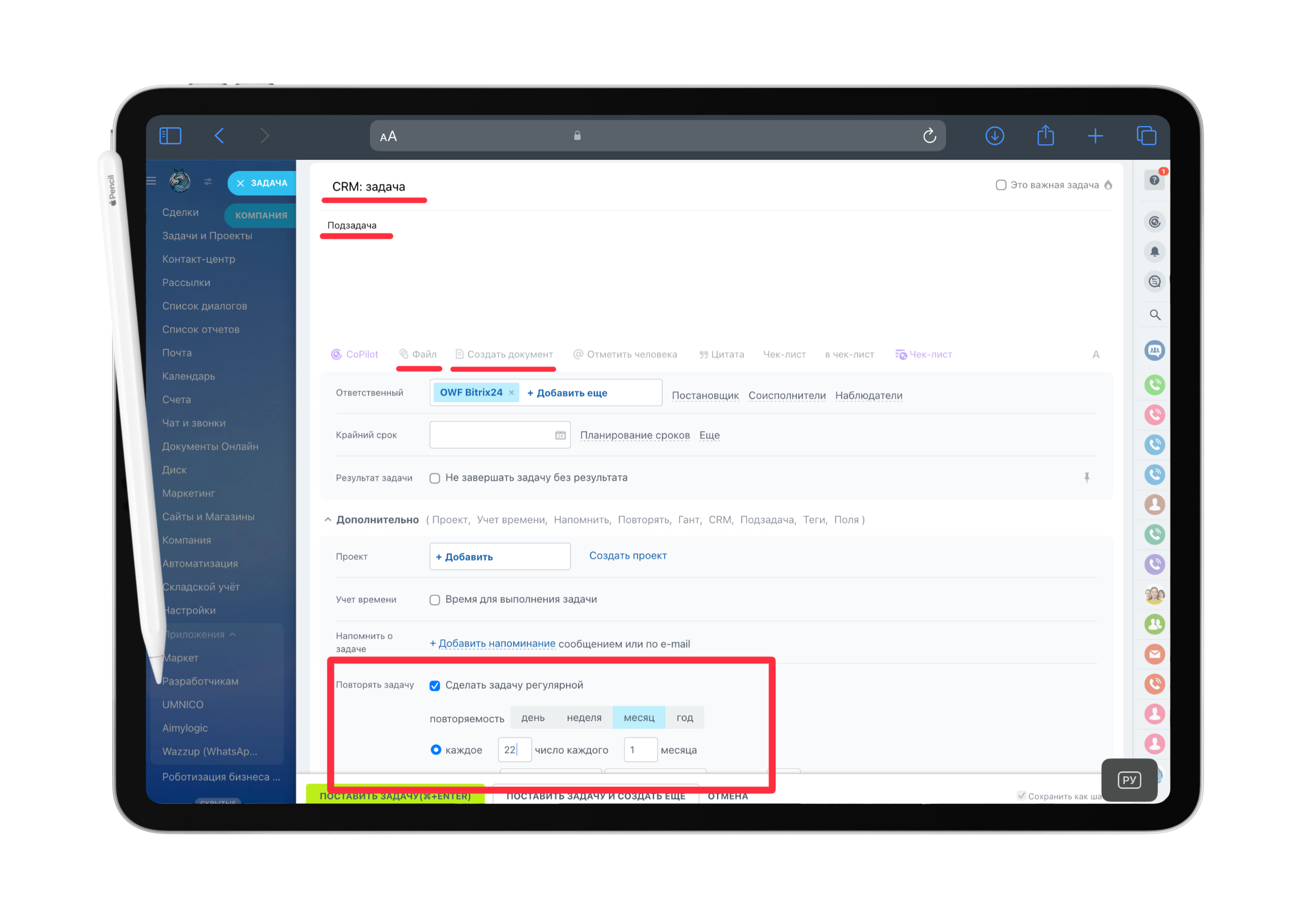 "Теперь, когда данные компании сохранены в Битрикс24, можно приступить к созданию задачи для этой компании. Вы имеете возможность настроить задачу как постоянную или единоразовую, в зависимости от потребностей и специфики работы с данной компанией."