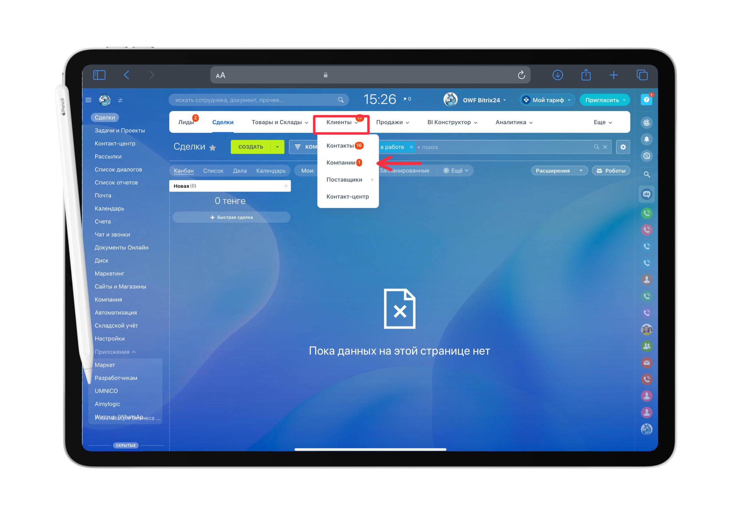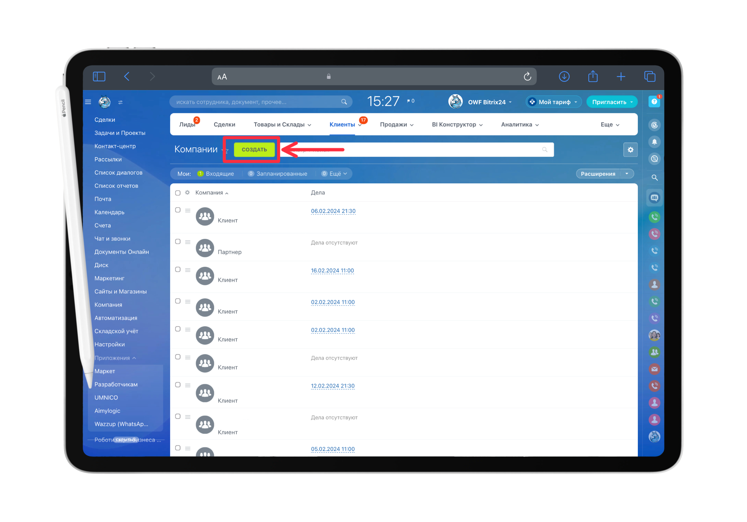 "Для доступа к нужному разделу в системе Битрикс24, необходимо сначала перейти в основной раздел 'Клиенты'. Внутри этого раздела следует выбрать категорию 'Компании', что позволит получить доступ к расширенным функциям и нужным инструментам управления."