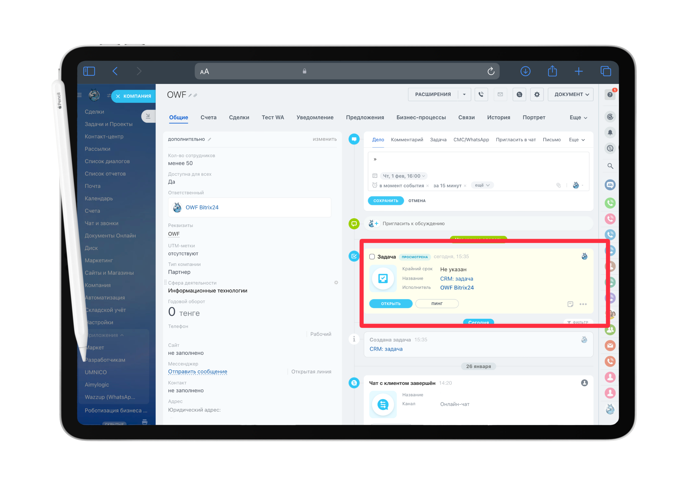 "Сохраненная задача теперь будет отображаться в карточке компании в системе Битрикс24. Это обеспечивает удобный доступ к информации о задаче в любое время и с любого устройства, включая ваш смартфон, что значительно упрощает процесс управления задачами и взаимодействия с компанией."
