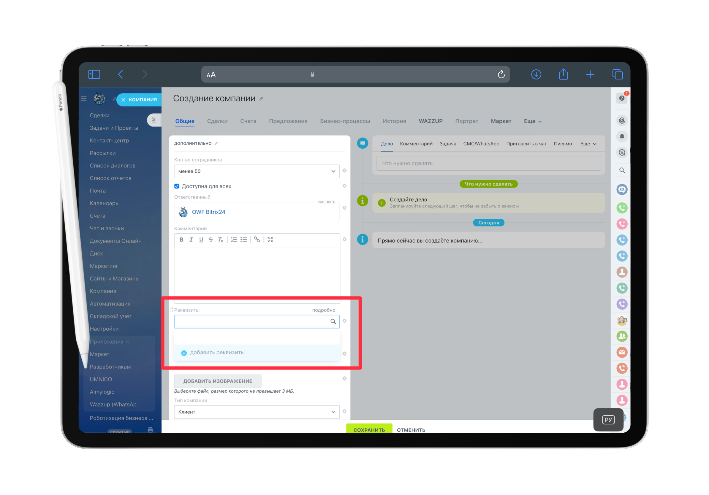 "В открывшемся окне Битрикс24 введите реквизиты компании, для которой создается задача. Система автоматически найдет компанию в базе юридических лиц и предоставит вам необходимые данные. Дополнительно вы можете ввести контактный номер компании и другую важную информацию. Не забудьте сохранить внесенные данные о компании для дальнейшего использования."