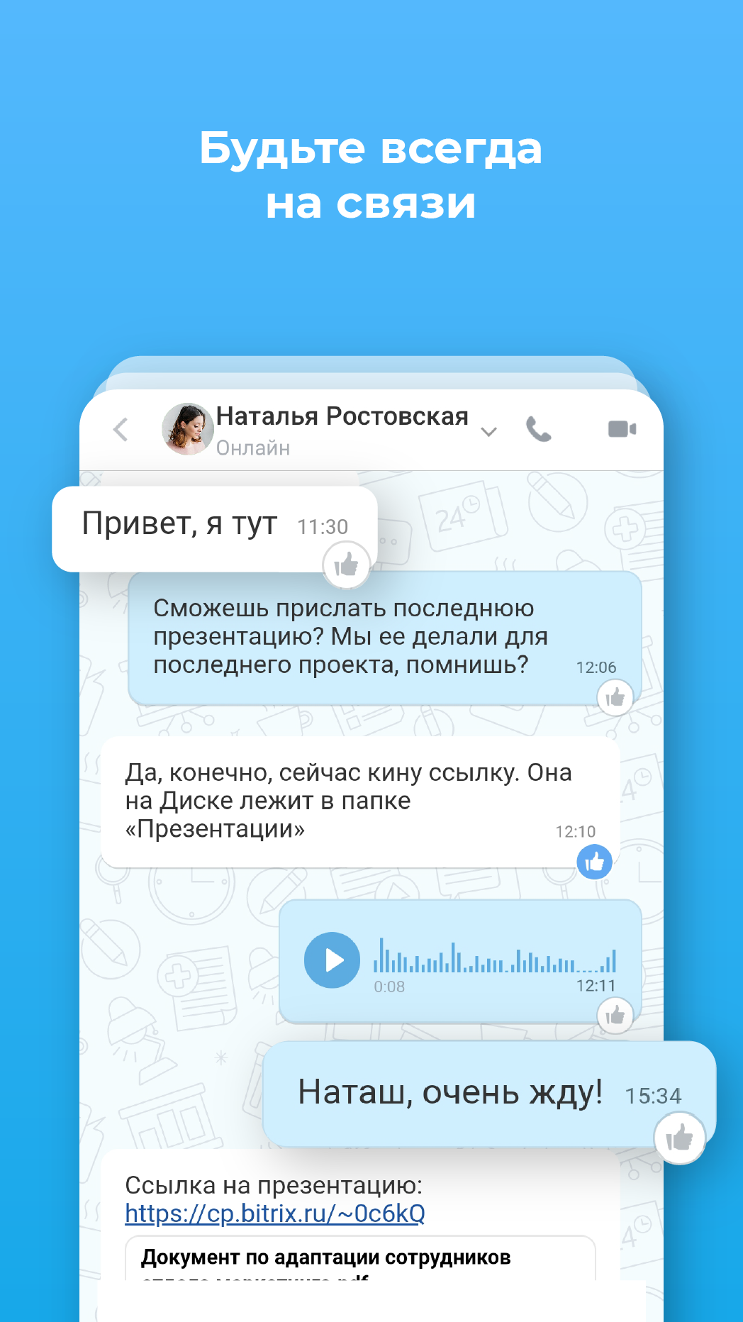 Пригласите сотрудников в единый онлайн-офис и используйте инструменты корпоративной соцсети: мессенджер и видеозвонки, календарь, онлайн-редактор документов, корпоративный диск.