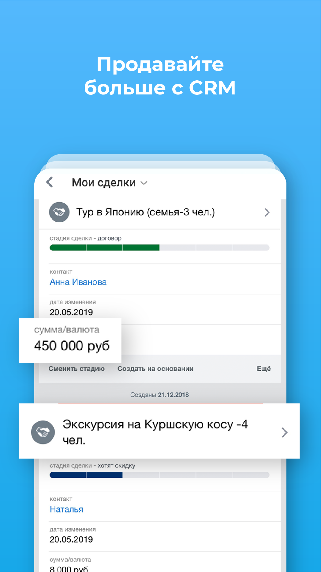 Создавайте сделки сразу на смартфоне. В мобильном приложении можно работать с CRM так же, как и на компьютере.