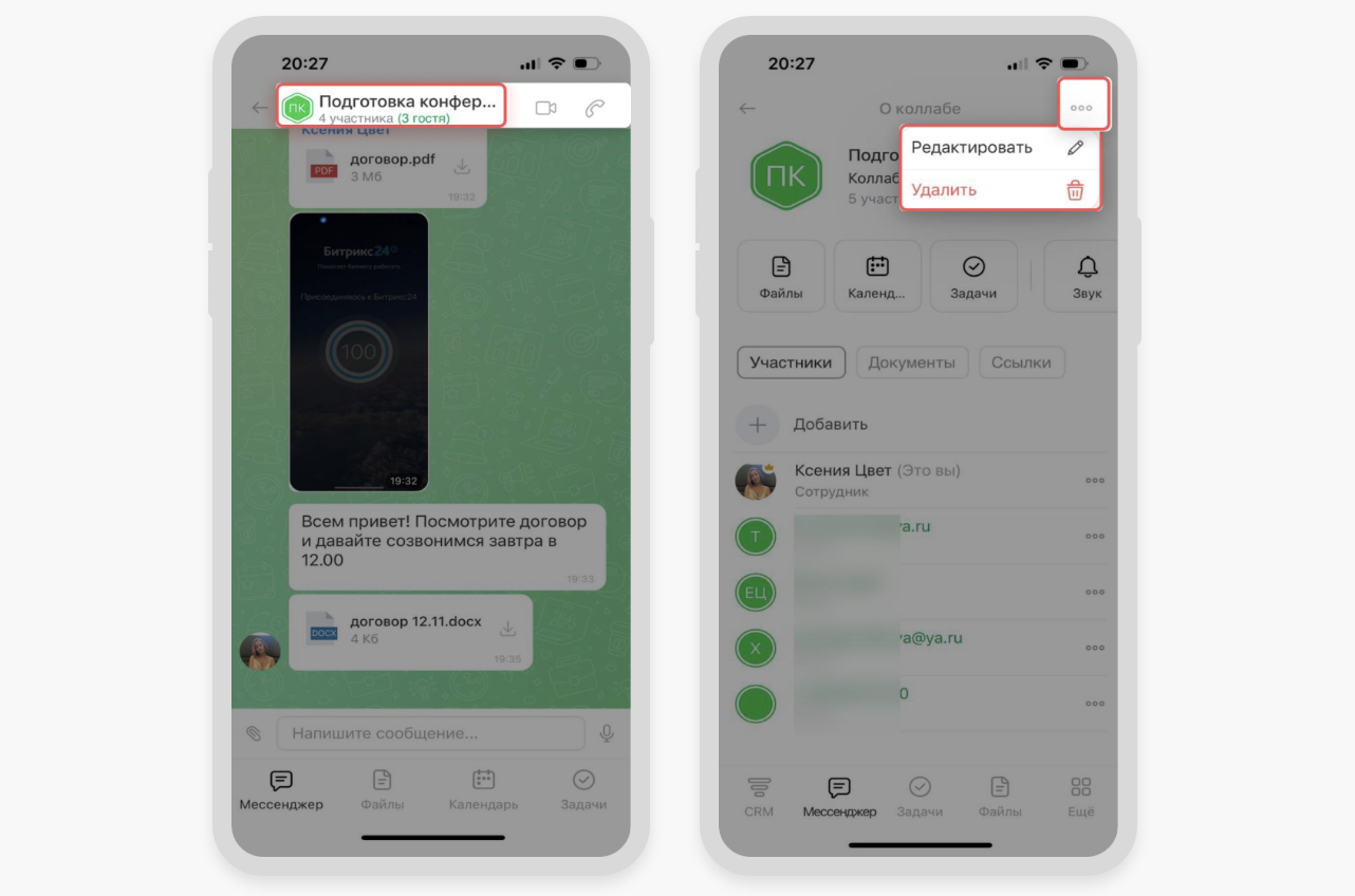 В чате коллабы можно создавать задачи и встречи, общаться в Битрикс24 и подписывать документы.